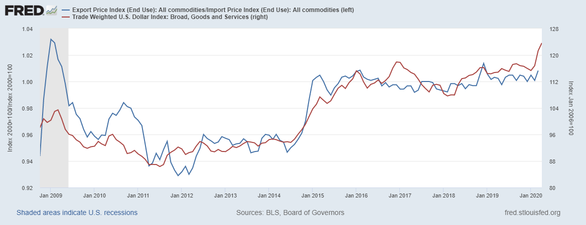 Мы видим, что рост доллара не соответствует росту торговых условий, т.е. дорогой доллар усложняет работу экспортеров США.