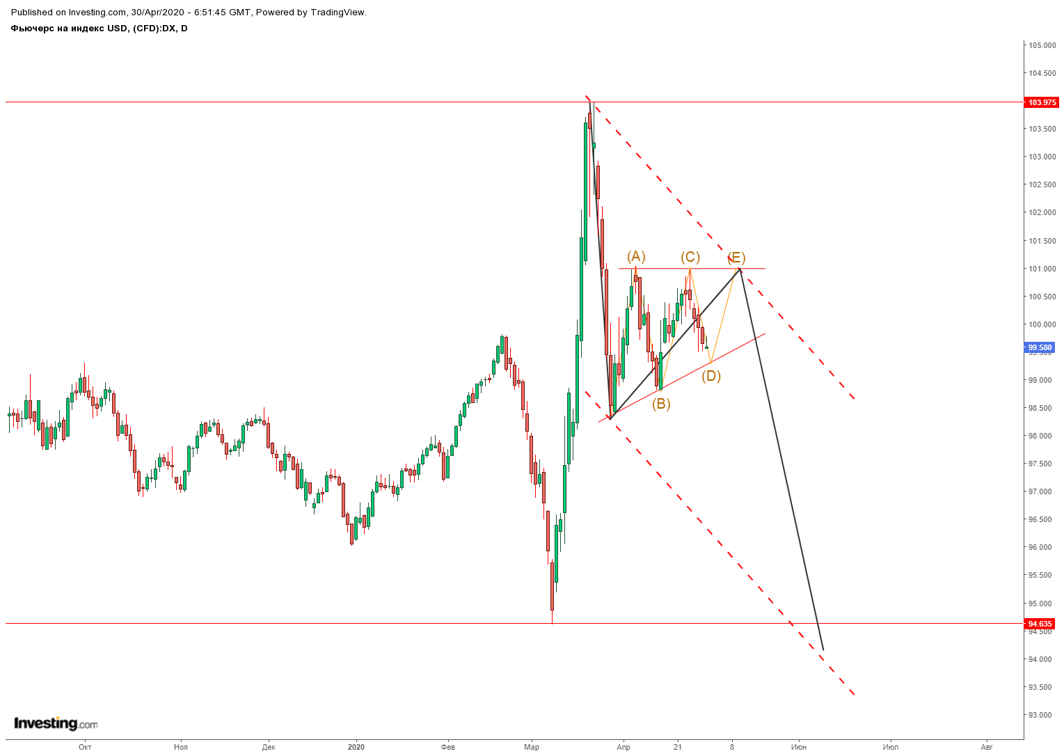 После чего нас ждет развитие новой фазы снижения индекса доллара с попыткой пробиться ниже поддержки н уровне 94,5 пунктов.