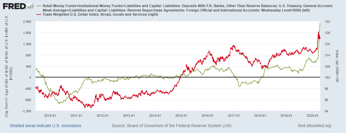 Данный процесс нанесен зеленой линией и включает в себя три базовых направления оттока денег из денежного рынка: счет Казначейства плюс РЕПО для нерезидентов, плюс вложения в денежный фонды. Этот показатель отложен по левой оси, и мы видим, что за год он вырос на 2 трлн долларов.