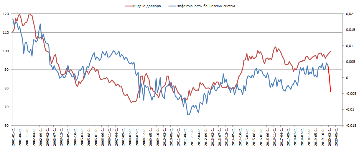 Мы видим, что когда показатель снижается, что соответствует переходу состояния ликвидности из сбережений в расходы - доллар падает (красная линия), и наоборот.