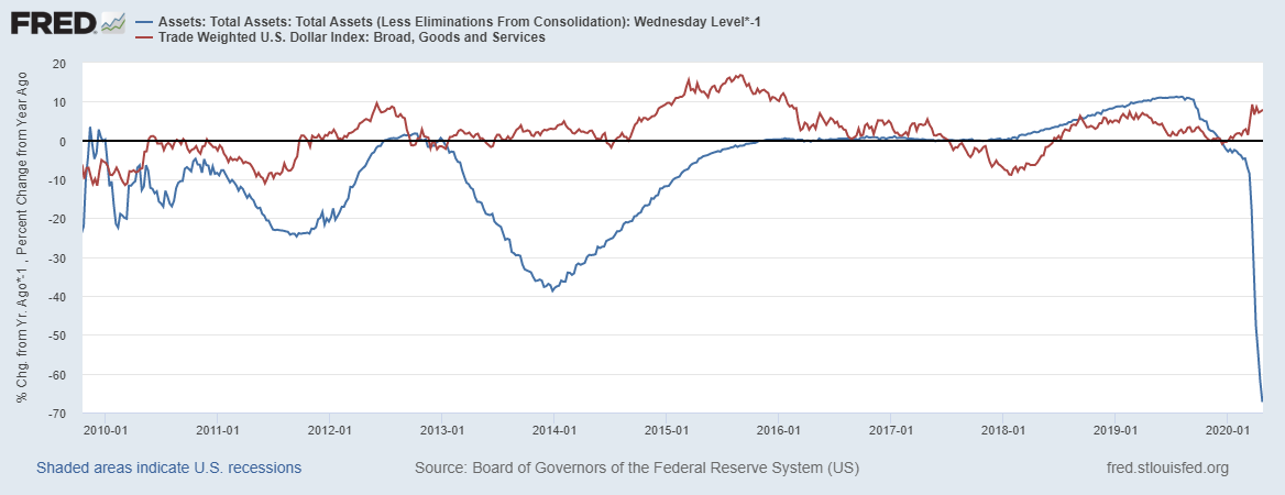 Стабилизационные процессы запущенные ФРС сильно раздувают баланс регулятора, давайте посмотрим, как влияет рост баланса ЦБ на национальную валюту.