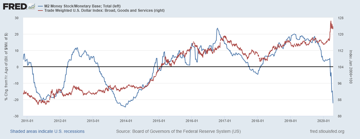 Мы видим, что снижение показателя оказывает понижательное давление на индекс доллара, т.к. долларов в системе становится очень много, и наоборот.