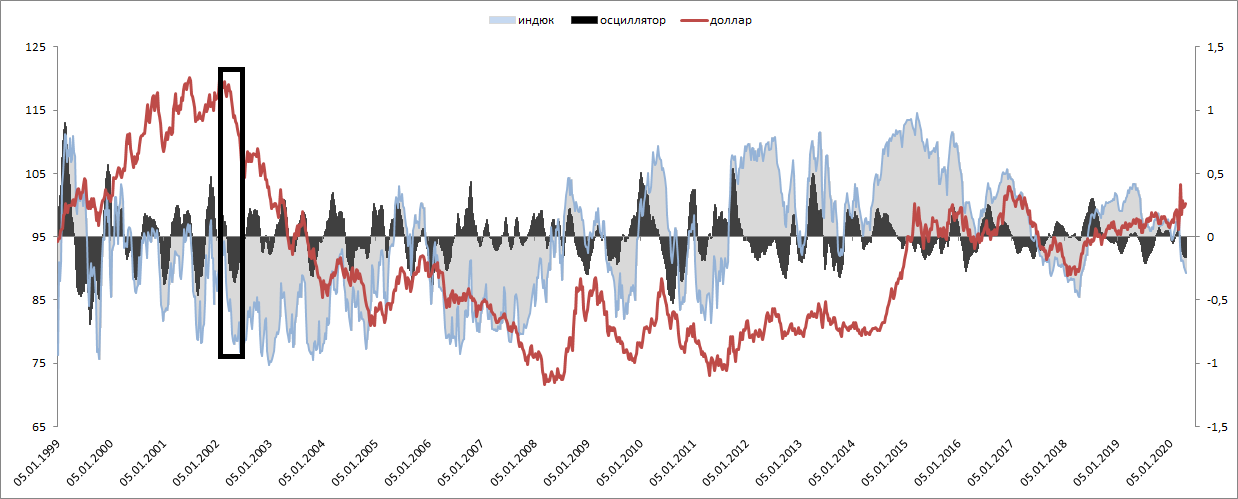 Исторический, точно такое поведение мы наблюдаем в 2002 году, когда индекс доллара DX был на многолетних пиках.