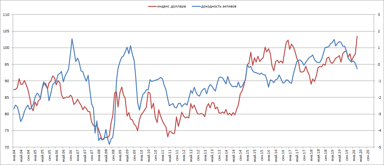 Мы видим, что связь между показателями тесная, это обусловлено реальной доходностью долларовых активов, чем выше реальная доходность, тем выше спрос на доллары. Если посмотреть со стороны макроэкономических теорий, то эта же зависимость имеет и более глубокую основу, рост реальной доходности возможен при росте процентной ставки, данный процесс снижает инфляцию.